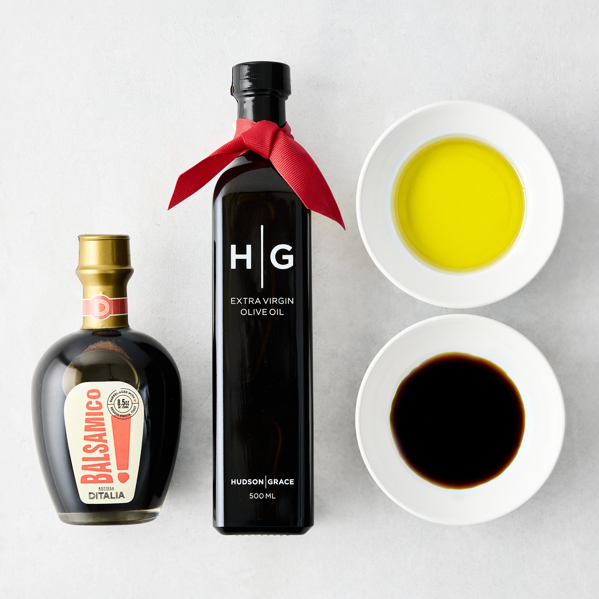 The perfect gift to give or receive. Whether for your favorite hostess, favorite chef, or favorite friend, The Perfect Dip Gift Set will cover all your dipping needs. With the Hudson Grace Hand-Pressed Olive Oil, Balsamico Vinegar, and two Dipping Bowls this set can be used for special occasions and casual weekday dinners.