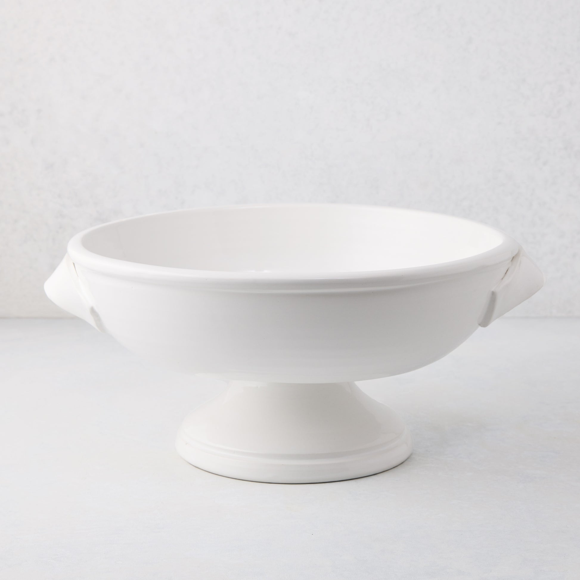 Bring Italian craftsmanship to your home with the Tivoli Ceramic Pedestal Serving Bowl, a statement piece for any gathering. Crafted in Italy, this serving bowl features our signature white glaze and two simple, yet elegant, handles. It is generously sized, ideal for entertaining and serving groups, or for displaying your fruit.
