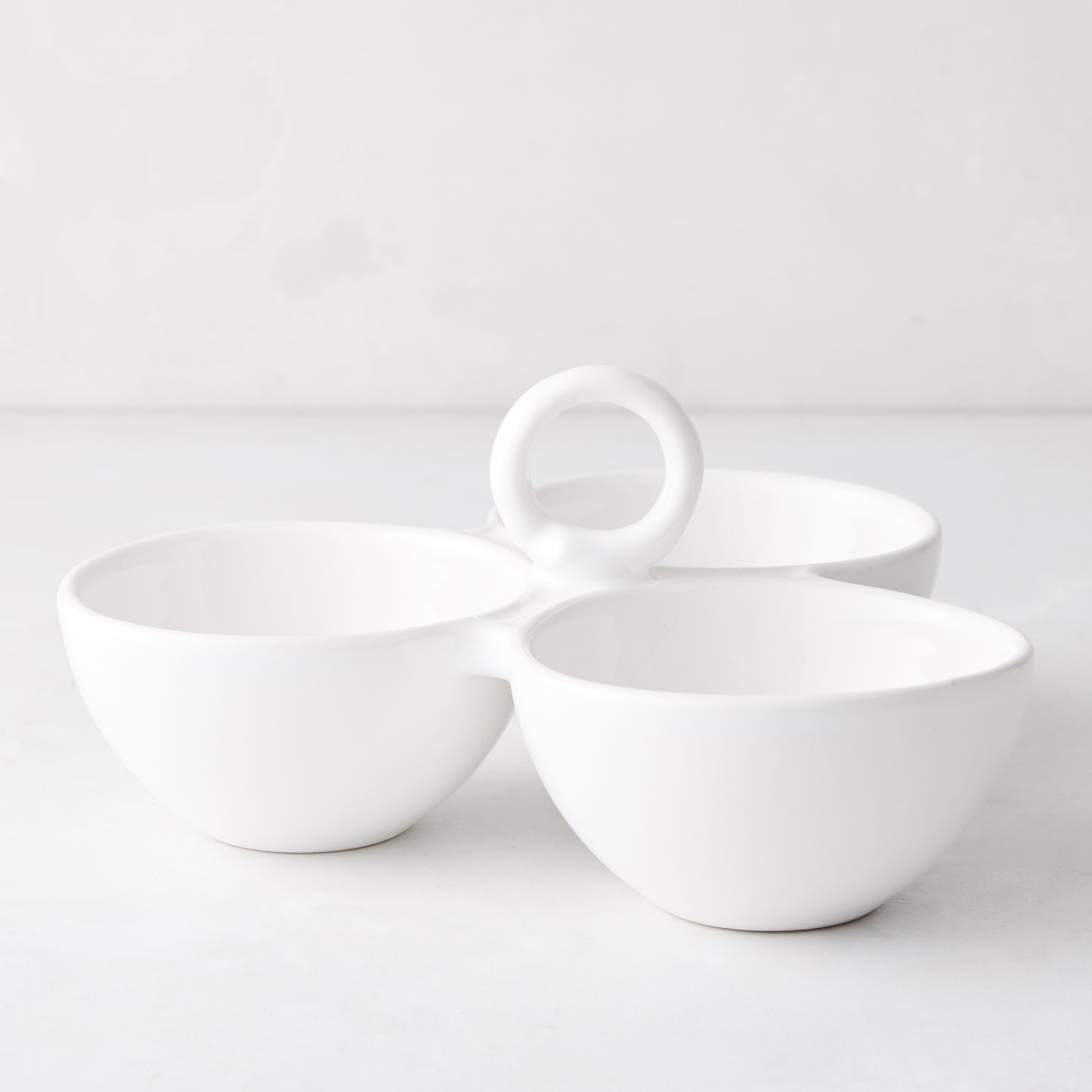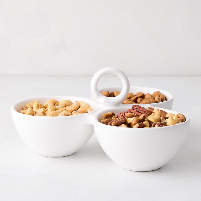This versatile Triple Serving Bowl offers a stylish and functional way to serve a variety of appetizers. Perfect for a variety of foods from nuts to dips, this serving bowl with ensure you meet all of your guests' needs. Crafted from high-quality ceramic for lasting beauty and durability.