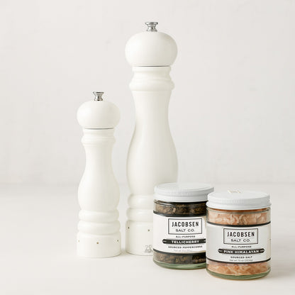 Our Glossy Piano Lacquer Mills and Jacobsen Peppercorns and Grinding Sea Salt set will present a mastery of a gift for the chef at home. Masterfully engineered, the pepper mill's case-hardened steel mechanism cracks peppercorns as the salt mill's stainless-steel mechanism crushes the salt crystals, both allowing an even yield. Crafted of sustainable beechwood, it's also fully adjustable from fine to coarse grind.
